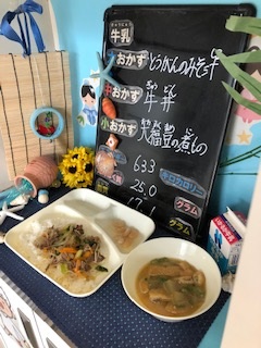 本日の給食は、「牛丼、牛乳、とうがんのみそ汁、大福豆の煮もの」でした。