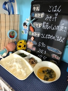 本日の給食は、「ご飯、牛乳、豚肉のしょうが焼き、みそ汁、さんどまめのごまあえ」でした。