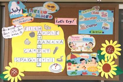 児童の皆さんに少しでも英語に親しんでもらえるよう工夫しています。毎月このボードの内容が変わります。楽しみにしておいてください。