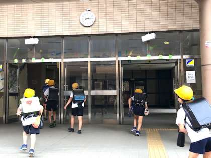 久しぶりに雨があがり、雨傘のない児童の登校のようすです。