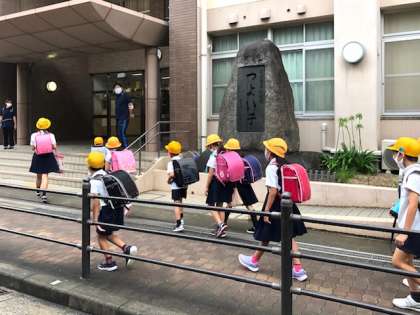 朝からの雨もやみ、蝉時雨の響きの中、土曜授業の今日、集団登校での子どもたちのようすです。