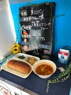 本日の給食は、「黒糖パン、牛乳、ケチャップ煮、さんどまめとコーンのソテー、りんごのクラフティ」でした。