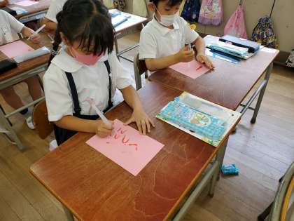 早速、1年生の子どもたちが筆ペンタイプのもので書いています。教科書にある水書用紙に、「くつ」と書き、とめやはらい、曲がりなど、線の太さを筆圧で調節しながら、「ぴたっ」「すうっ」とうまく表現していました。