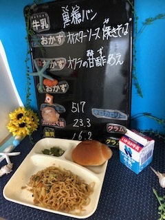本日の給食は、「黒糖パン、牛乳、オイスターソース焼きそば、オクラの甘酢あえ」でした。