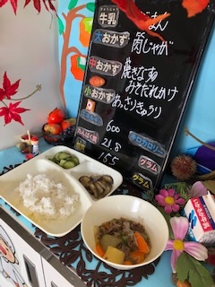 本日の給食は、「ご飯、牛乳、肉じゃが、焼きなすのみそだれかけ、あっさりきゅうり」でした。