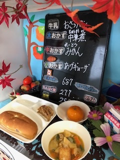 本日の給食は、「おさつパン、牛乳、あげぎょうざ、中華煮、みかん(冷)」でした。