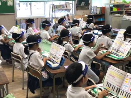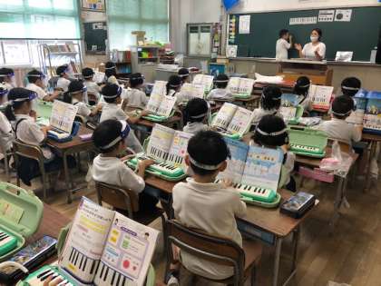 鍵盤ハーモニカで、「いろいろな おとを みつけましょう」の学習です。フェイスシールドをつけての練習ですが、楽しく活動できました。