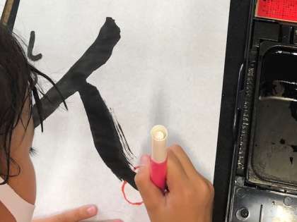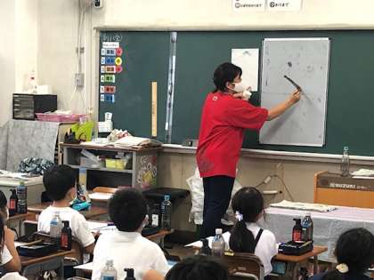 「人」の単元で、左払いと右払いの練習をしているところです。子どもたちは、試し書きをした後、教科書の手本を見て自分の課題を見つけて書き込んでいます。