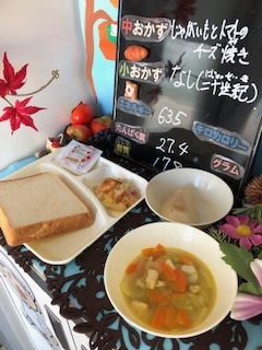 本日の給食は、「食パン、りんごジャム、牛乳、鶏肉とてぼ豆のスープ煮じゃがいもとトマトのチーズ焼き、なし(二十世紀)」