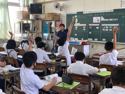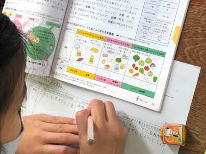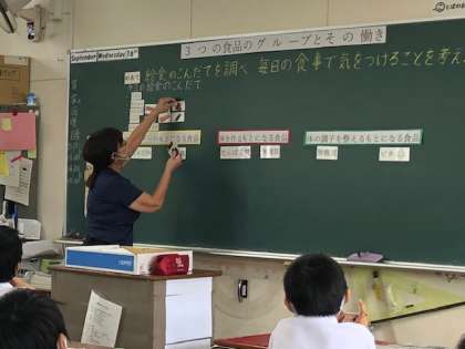 「食べて元気に」の単元で、給食の献立から3つグループに分けて、バランスのよい食事について考えました。