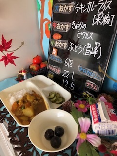 本日の給食は、「チキンカレーライス[米粉]、牛乳、きゅうりのピクルス、ぶどう(巨峰)」でした。