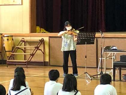 ヴァイオリンと打楽器のメンバーの方が来てくださり、オープニングは『真田丸』のテーマ曲でした。その後、ヴァイオリンやタンバリン、カスタネットなどの楽器紹介もあり、子どもたちも興味深く静かに聞き入っていました。
