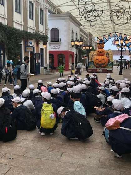 クラスごとに集合写真を撮り、説明を聞いた後、グループに分かれて活動しています。