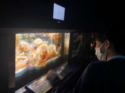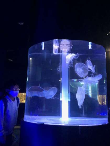 ミズクラゲがライトアップされ、優雅に泳いでいます。
