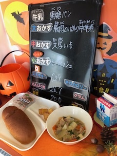 本日の給食は、「黒糖パン、牛乳、豚肉といかの中華煮、大学いも、ミニフィッシュ」でした。
