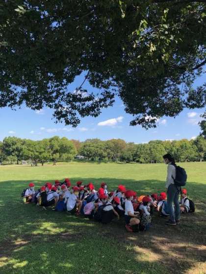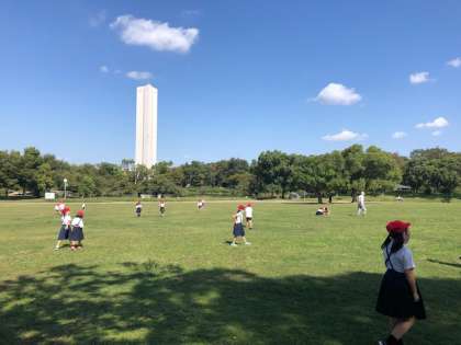 秋晴れのもと広い芝生広場にて、思いっきり走り回っています。
