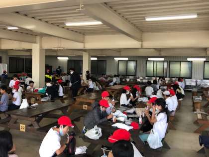 焼き板工作が完成し、おやつにジュースをいただいています。