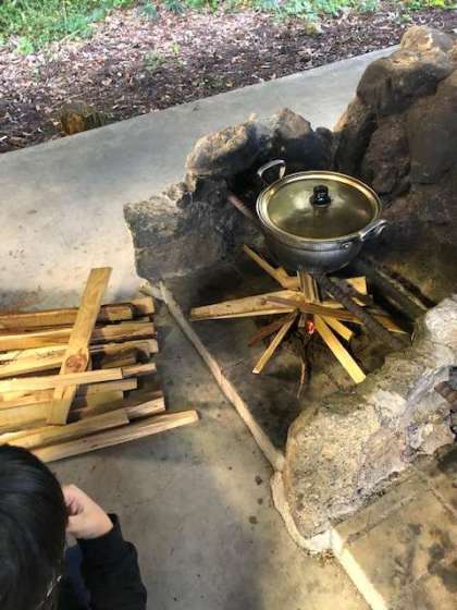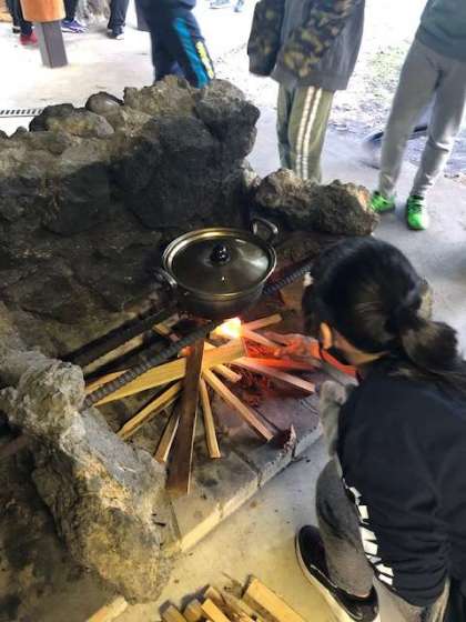 うまく火起こしができた班から鍋をのせ煮込み始めています。