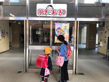 この写真のように、「げんきにあいさつ」と玄関に掲げられています。少しずつ子どもたちも意識して元気に挨拶できるようになってきています。