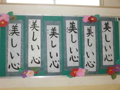 5年生の作品を紹介します。「美」という字は、横線が4本もあって、それをしっかり等間隔で、かつ勢いをつけて書くとこと、また左払いと右払いをバランスよく書くことなど、大変難しい字です。また、「心」という字も、勢いをつけ、腕を大きくふるって書くことが大事ですが、どの作品もしっかり書けています。今年1年間、「美しい心」を大事にしたいものです。