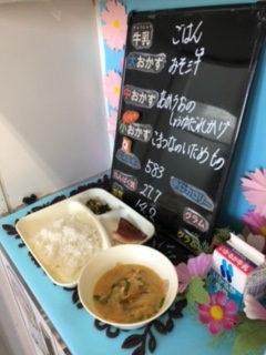 本日の給食は、「ご飯、牛乳、あかうおのしょうゆだれかけ、みそ汁、こまつなのいためもの」でした。