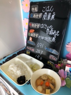 本日の給食h、「ご飯、牛乳、関東煮、はくさいの甘酢あえ、のりのつくだ煮」でした。