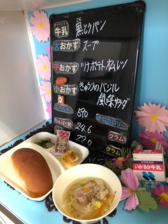 本日の給食は、「黒糖パン、牛乳、ツナポテトオムレツ、スープ、きゅうりのバジル風味サラダ」でした。