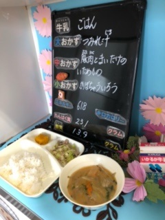 本日の給食は、「ご飯、牛乳、豚肉とまいたけのいためもの、つみれ汁、かぼちゃういろう」でした。