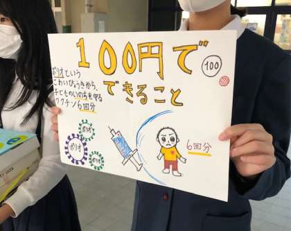 集まった募金のうち 100円で、ポリオから子どもを守るためのワクチンを6回分、下痢で体から水分がなくなって命を失うことを防ぐ経口補水塩を14袋、など支援物資を調達できるそうです。