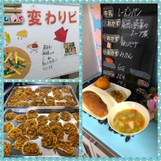 本日の給食は、「レーズンパン、牛乳、豚肉と野菜のスープ煮、変わりピザ、みかん」でした。