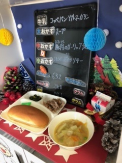 本日の給食は、「コッペパン、ソフトマーガリ、牛乳、豚肉のガーリック焼き、スープ、ほうれんそうのソテー」でした。
