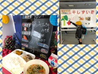 12月18日の給食は、「ご飯、牛乳、豚肉と干しずいきのみそ煮、すまし汁、焼きかぼちゃの甘みつかけ」でした。