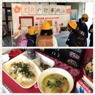 給食では、金時にんじんを使用し、関西風の白みそ仕立てのぞう煮が登場します。また、ごまめは、「田作り」とも言われるが、昔、肥料としてカタクチイワシを田にまいたところ、豊作になったことから、五穀豊穣を願う意味がこめられています。