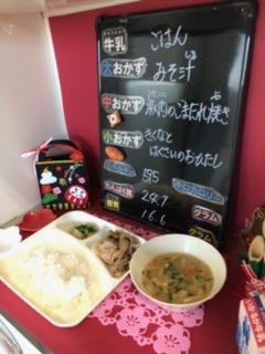本日の給食は、「ご飯、牛乳、豚肉のごまだれ焼き、みそ汁、きくなとはくさいのおひたし」でした。