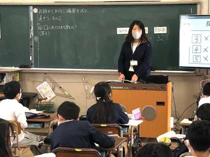 算数科で、「□を使って場面を式に表そう」の単元です。未知数があっても□を用いると文脈通りに式に表せること、その□にあてはまる数の調べ方を学習しました。