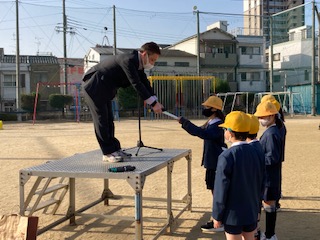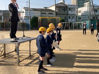 雲一つない晴天のもと、久しぶりに運動場で児童朝会を行いました。
