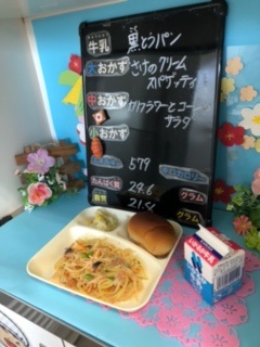 本日の給食は、「黒糖パン、牛乳、さけのクリームスパゲッティ、カリフラワーとコーンのサラダ」でした。