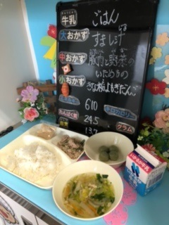 本日の給食は、「ご飯、牛乳、豚肉と野菜のいためもの、すまし汁、きな粉よもぎだんご」でした。
