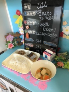 本日の給食は、「ご飯、牛乳、さごしのおろしじょうゆかけ、一口がんもとさといものみそ煮、れんこんのいためもの」でした。