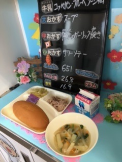 本日の給食は、「コッペパン、牛乳、豚肉のガーリック焼き、スープ、サワーソテー」でした。