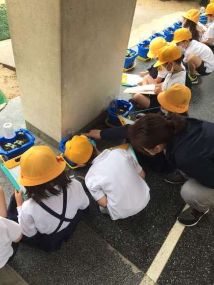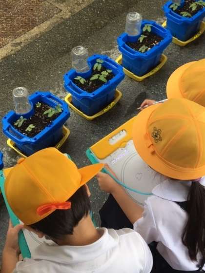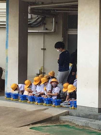 事前に先生が、渡り廊下に植木鉢をひとつひとつ
