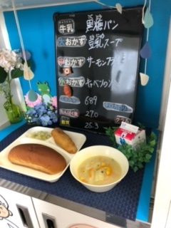 本日の給食は、「サーモンフライ、豆乳スープ、キャベツのソテー、黒糖パン、牛乳」でした。