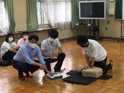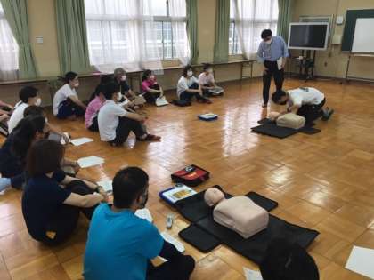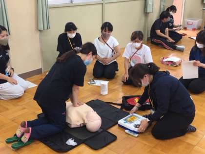 みんなで、心肺蘇生や胸骨圧迫の方法、AEDの使い方を確認。