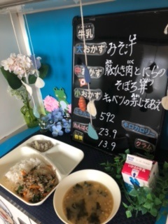 本日の給食は、「豚ひき肉とにらのそぼろ丼、みそ汁、キャベツの赤じそあえ、牛乳」でした。