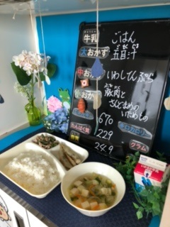 本日の給食は、「いわしてんぷら、五目汁、豚肉とさんどまめのいためもの、ご飯」でした。