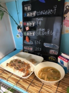 本日の給食は、「牛丼、とうがんのみそ汁、白花豆の煮もの、牛乳」でした。