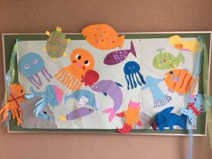 ぜひ、掲示委員会の子どもたちがつくったかわいい魚たちに、
