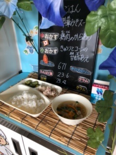 本日の給食は、「鶏肉のからあげ、中華みそスープ、きゅうりとコーンの甘酢あえ、ごはん、牛乳」でした。