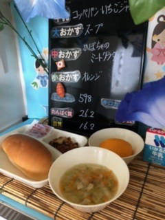 本日の給食は、「かぼちゃのミートグラタン、スープ、オレンジ、コッペパン、いちごジャム」でした。