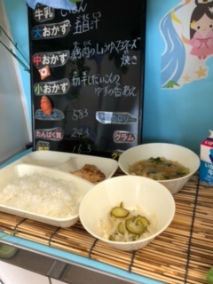 本日の給食は、「鶏肉のしょうゆマヨネーズ焼き、五目汁、切干しだいこんのゆずの香あえ、ご飯、牛乳」でした。